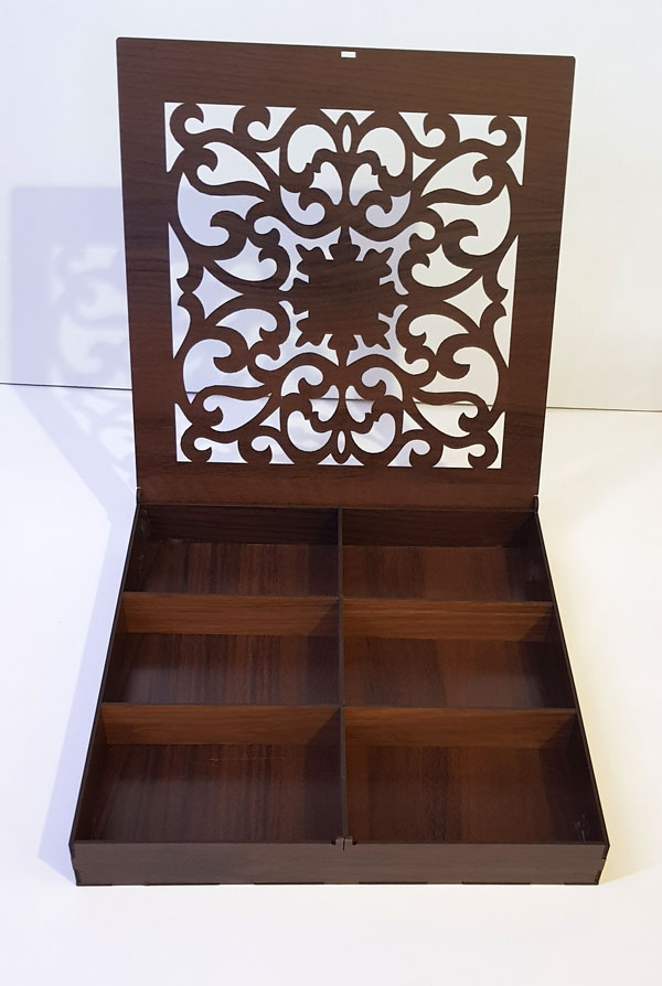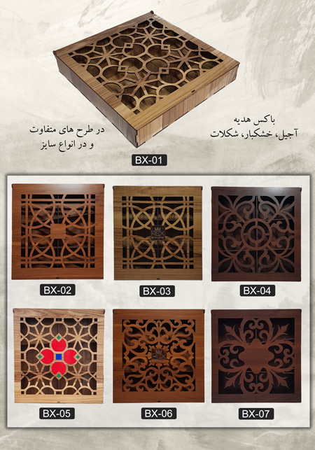 جنس تمامی اجزای باکس چوبی از نوع ام دی اف سه میل خارجی با کیفیت میباشد که با دستگاه لیزر با دقت بالا برش داده شده است. همچنین داشتن انواع طرحهای چوبی روشن و تیره نیز زیبایی باکس ها رو دو چندان کرده است.